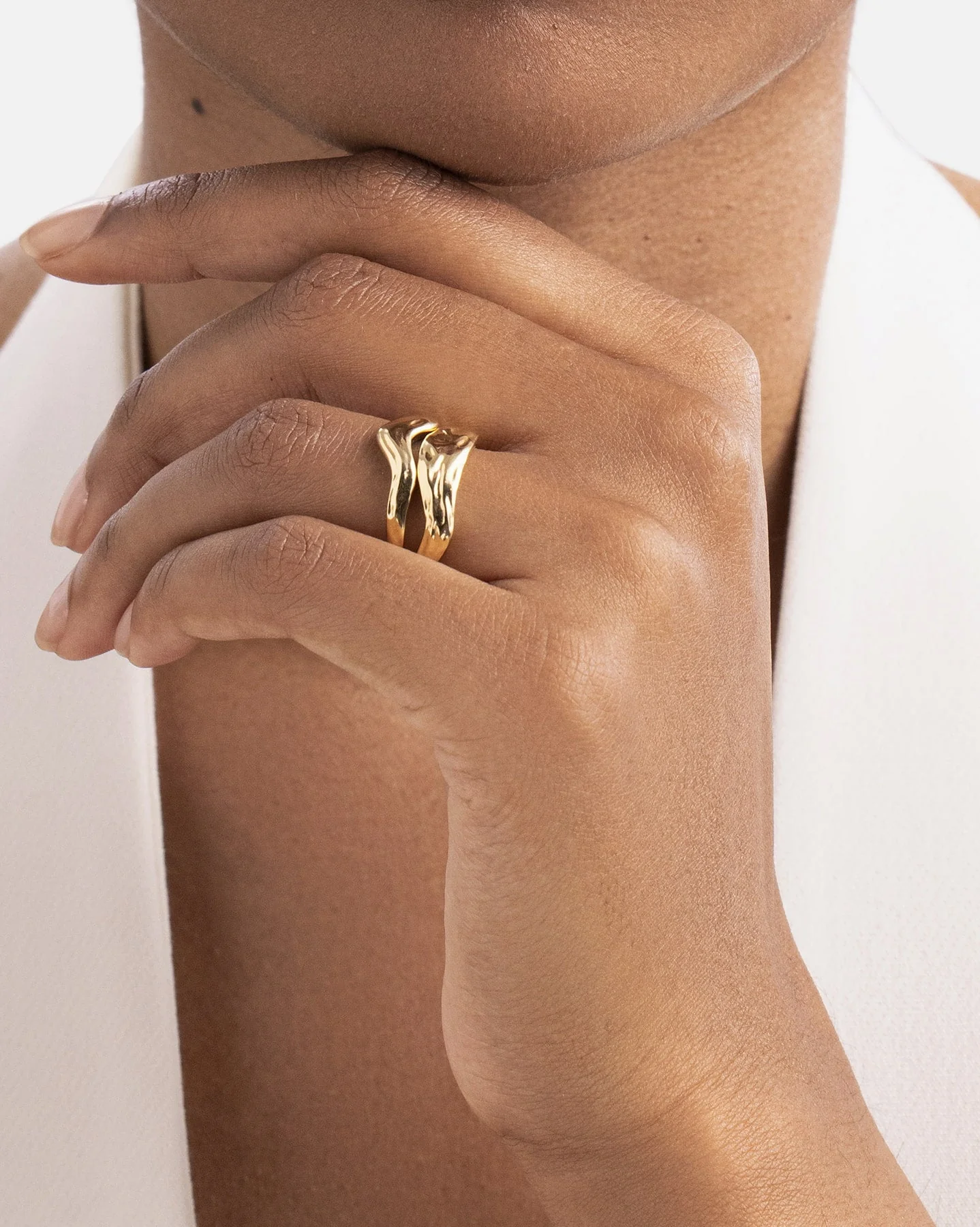 Das Empreinte Ring Set ist inspiriert von der unperfekten Schönheit der Natur. Es besteht aus zwei Ringen mit einer wellenförmigen Oberfläche, die an flüssiges Metall erinnert. Trage sie zusammen an einem Finger oder verschenke einen Ring an eine besondere Person in deinem Leben.