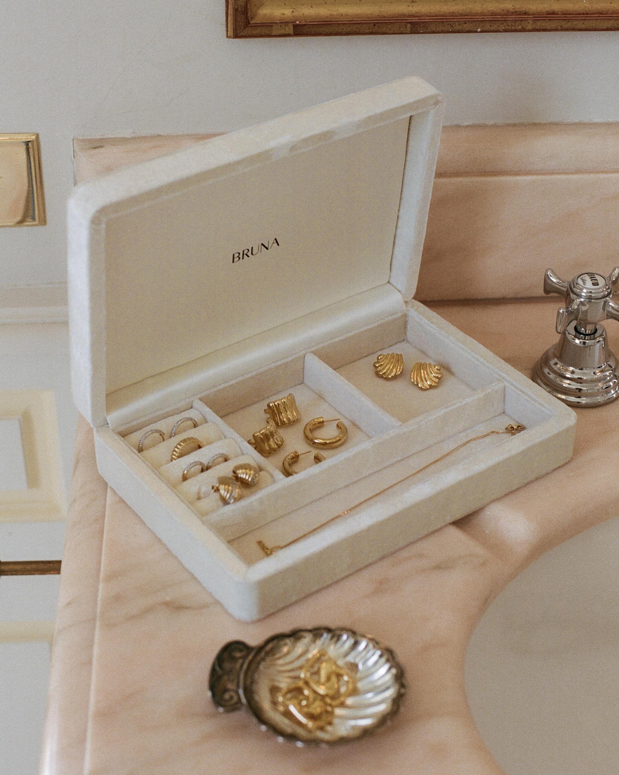 Organisiere deinen Schmuck mit unserer Velvet Jewelry Box. Mit einem weich gepolsterten Innenfutter, dem BRUNA-Logo auf der Innenseite und Fächern für Ringe, Ohrringe, Halsketten und andere Kostbarkeiten bewahrst du alles stilvoll auf.